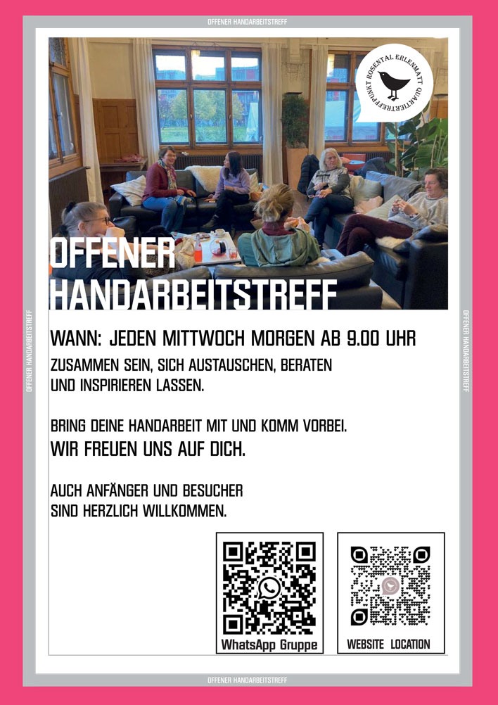 Was: Zusammen sein, sich austauschen, beraten und inspirieren lassen. Bring deine Handarbeit mit und komm einfach vorbei. Wir freuen uns auf dich.
