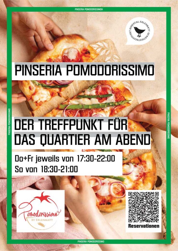 Komme vorbei und geniesse bei uns eine leckere, frisch zubereitete Pinsa von der Quartierspinseria Pomodorissimo! Dazu gibt es Getränke an unserer Bar.
