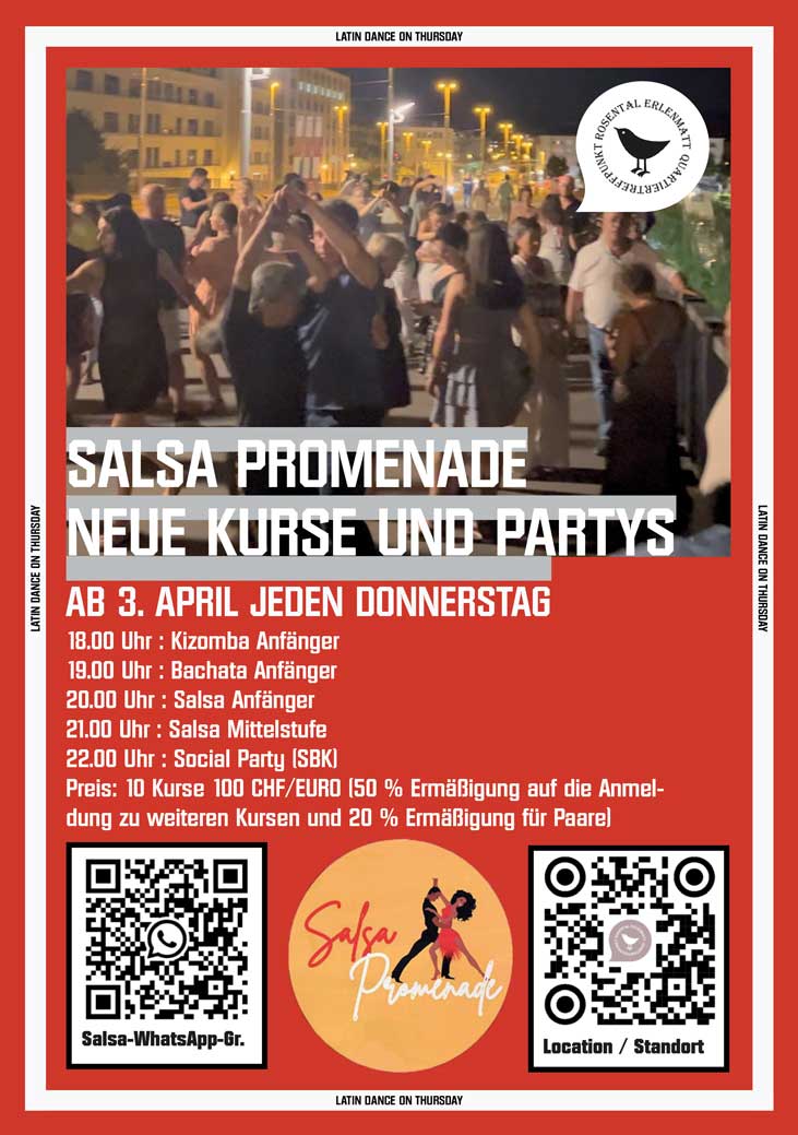 20250626Ob Anfänger oder schon etwas Fortgeschritten, kommt vorbei und teilt mit uns die Freude an den lateinamerikanischen Tänzen Bachata und Salsa. Armand, unser Tanzlehrer freut sich darauf, Euch neue Schritte und Figuren beizubringen!