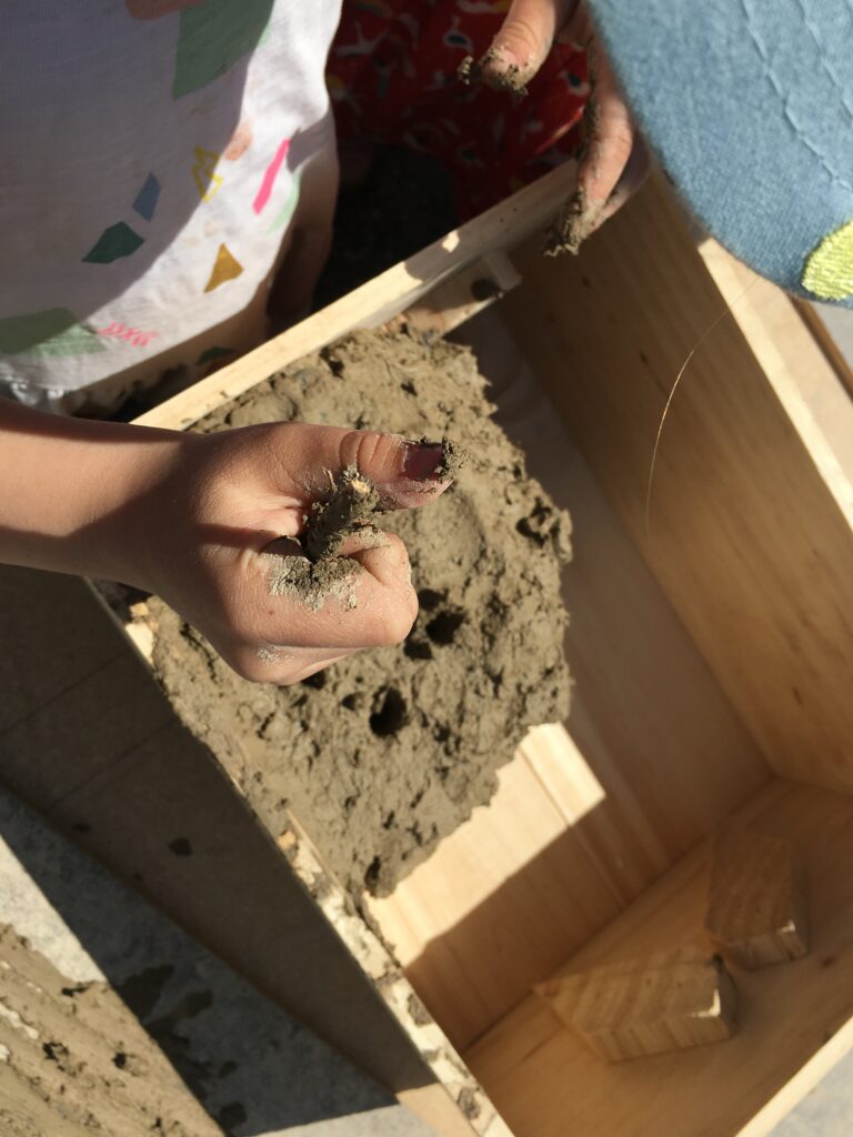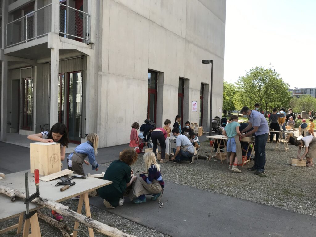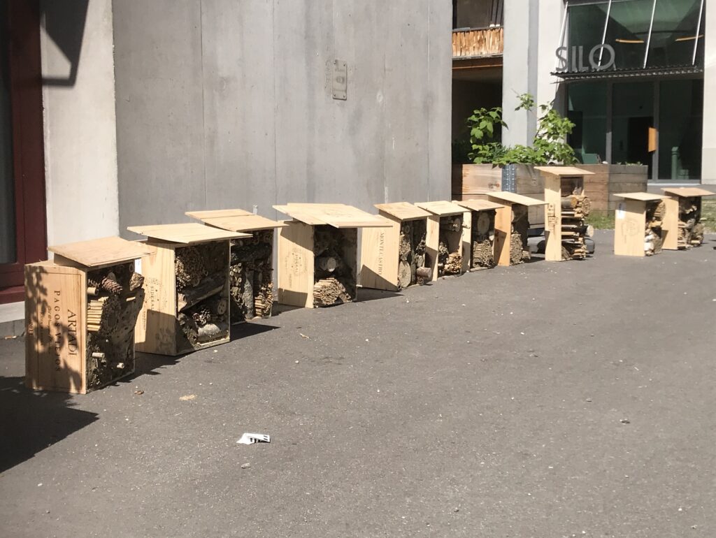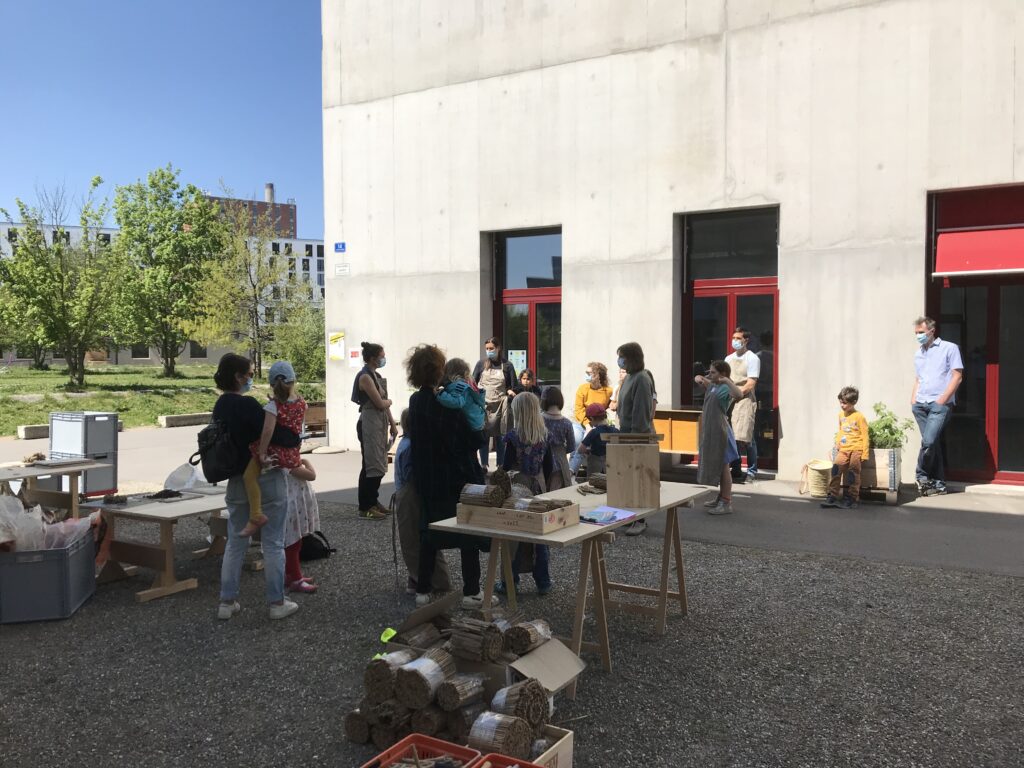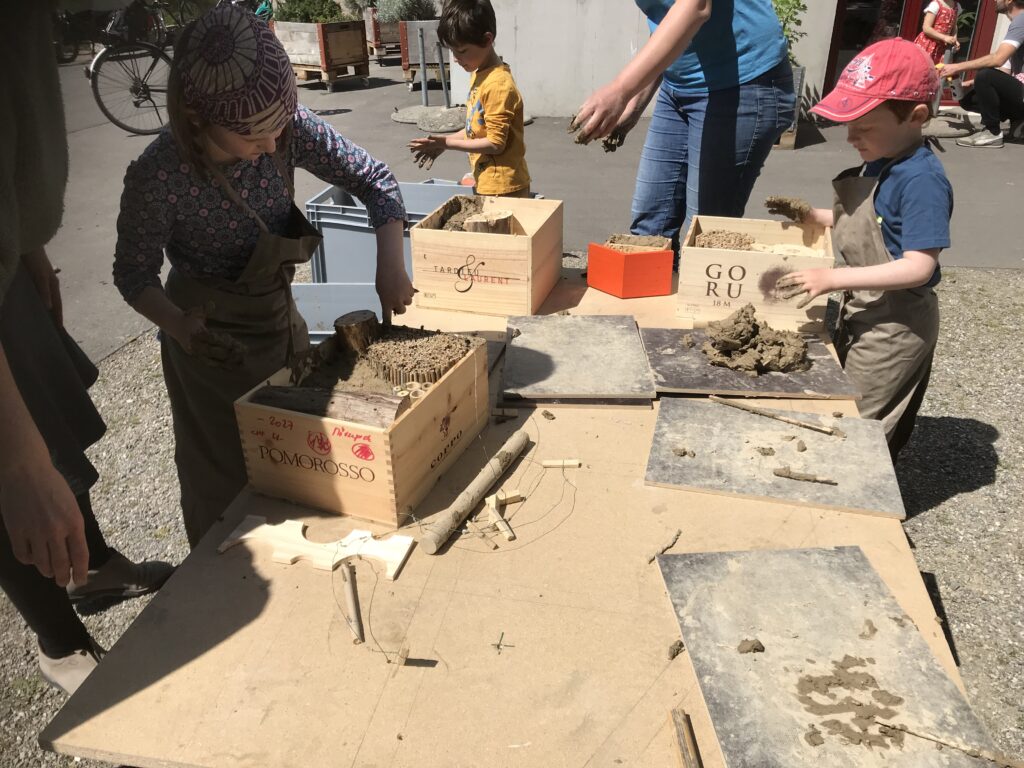 Der Workshop richtete sich in erster Linie an Kinder aus dem Quartier. Doch auch die begleitenden Erwachsenen fanden ihre Freude am Bauen. Mit verschiedenen Materialen wie Lehm, Holz und Schilf wurden in alten Weinkisten ganz unterschiedliche Hotels gebaut, je nach Bienengeschmack! Damit die Bienen auch zu Futter kommen, konnten die Kinder zusätzlich noch Samenbomben herstellen.
